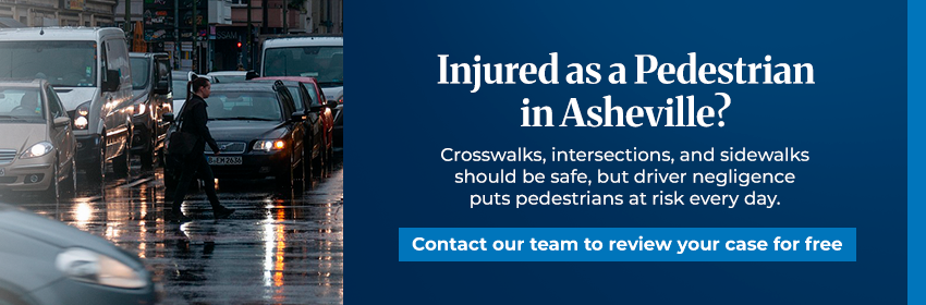 Driver negligence causes most pedestrian crashes in Asheville. Failure to yield, distracted driving, speeding, and impaired driving all put people on foot in danger. Poorly designed intersections and inadequate lighting also contribute to accidents.